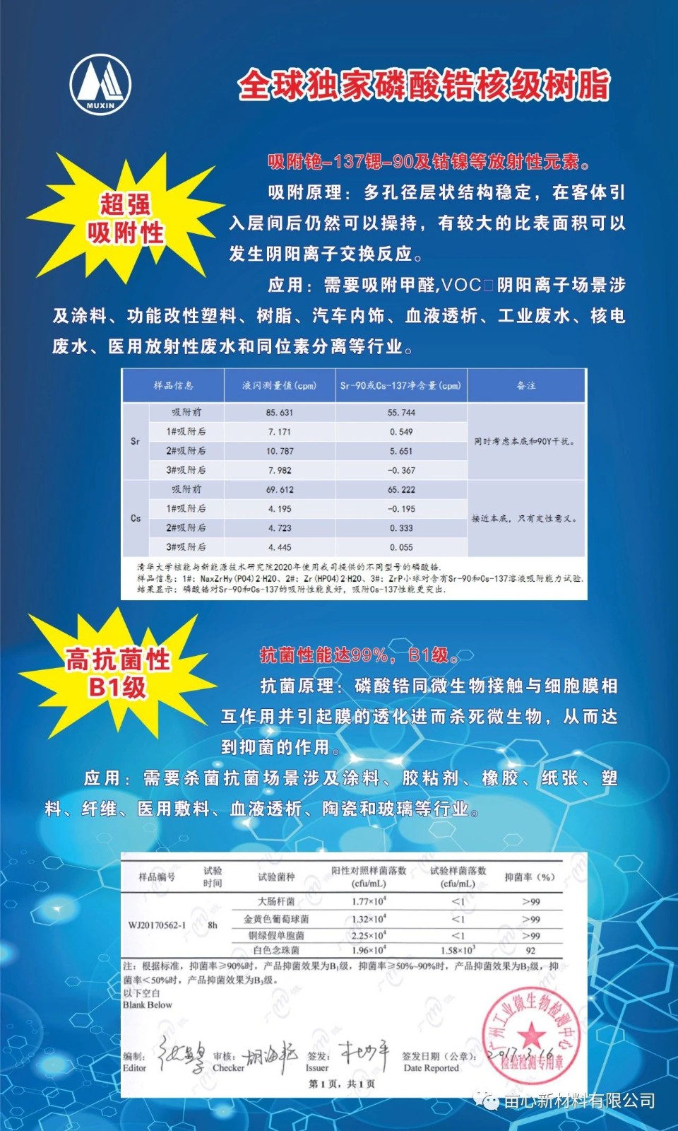 四川畝心新材料有限公司(英文名:“Resin&Zircon Technology Co., Ltd.”)是全球獨(dú)家生產(chǎn)磷酸鋯系列功能樹(shù)脂的高新技術(shù)企業(yè),我們提供磷酸鋯核級(jí)樹(shù)脂、通用樹(shù)脂、醫(yī)療放射性廢水一站式處理解決方案。